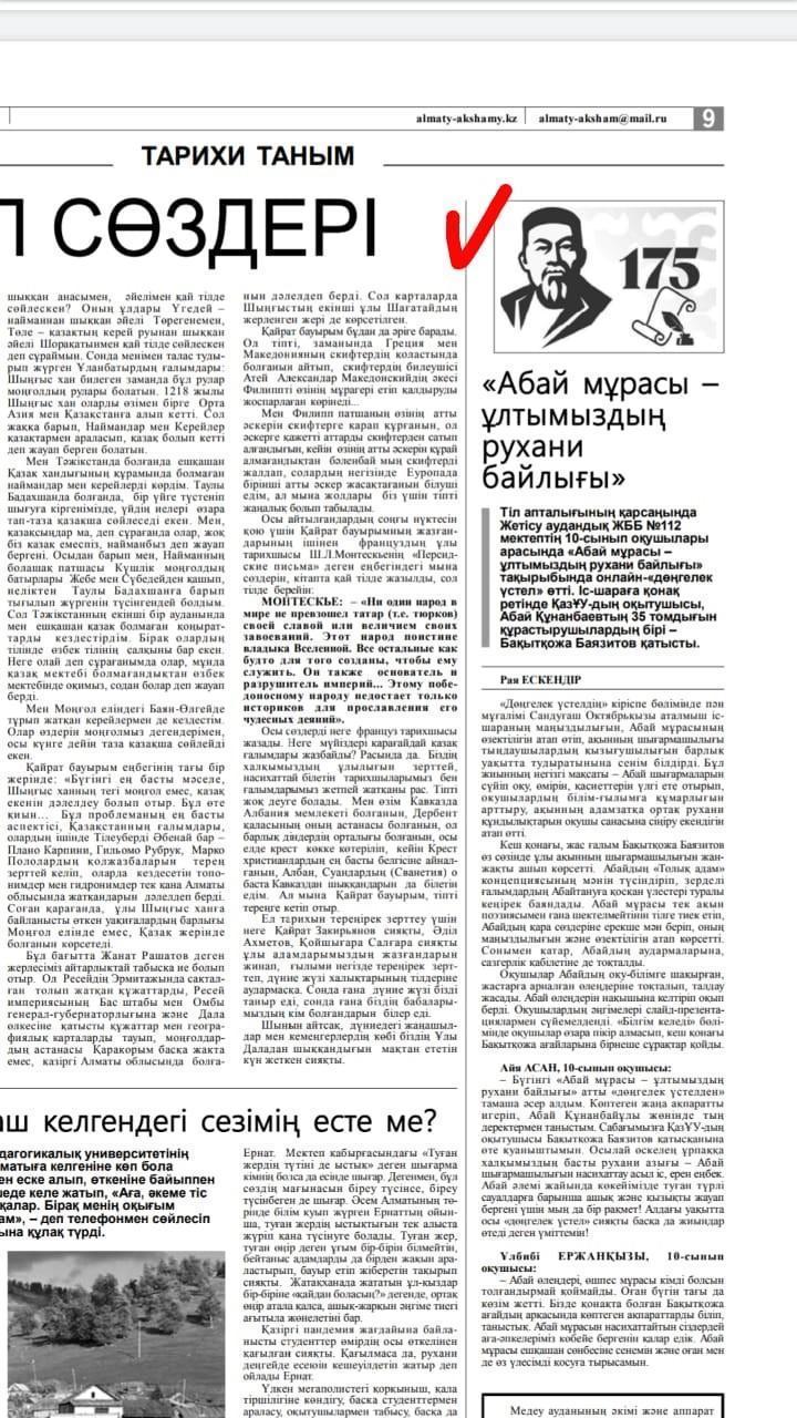 Тіл апталығының қарсаңындаАлматы қаласы Жетісу аудан №112 жалпы білім беретін мектепте 10-сынып оқушылары арасында «Абай мұрасы ұлтымыздың рухани байлығы» тақырыбында онлайн- дөңгелек үстел өтті Іс-шарамыздың қонағы ҚазҰУ-нің оқытушысы, Абай Құнанбаевтың 35томдығын құрастырушылардың бірі – Бақытқожа Баязитов қатысты. Аталған іс- шара қаламыздың «Алматы ақшамы» атты газетіне жарияланды.