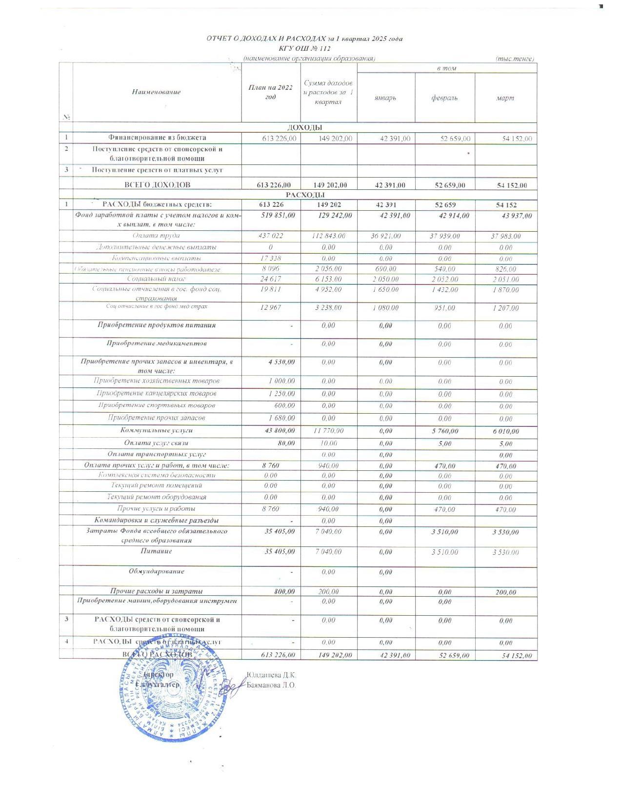03 ақпан 2025 0 1 2 3 4 5 ОТЧЕТ О ДОХОДАХ И РАСХОДАХ за 1 квартал 2025 года КГУ ОШ №112 Осы беттің QR-коды:QR-код этой страницы: